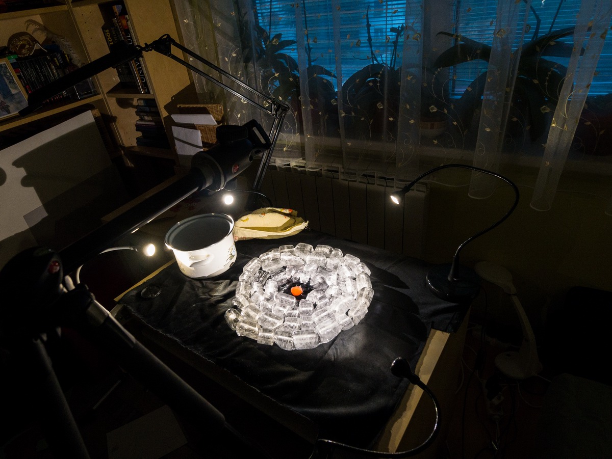 Gata materialele, hai cu aranjamentul, să facem un hallucinating vortex cu roșu-n mijloc și fără pisică înainte să se topească totul pe masă. Și să așez și lumina de contur frumos. Varietatea asta de pisică (Maine Coon) e fascinată de apă în toate formele, complet atipic. E mereu ud pe labe cumva.